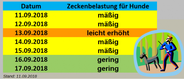 Das überwiegend trockene Wetter, welches uns über weite Teile dieser Woche begleitet, setzt dem Zecken- und Hundezeckenbesatz im Unterholz zu. Die Risiken im Unterholz sind allenfalls noch als mäßig einzustufen.