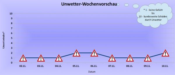 Die Gefahr vor Unwettern bleibt in der nächsten Woche verbreitet nur sehr gering. Bei weitgehend stabilem, trockenem und zumindest tagsüber oft mildem Herbstwetter bildet sich vor allem in Muldenlagen und entlang der Flüsse gebietsweise Nebel. Die Nächte werden tendenziell etwas kälter, bleiben jedoch größtenteils frostfrei, im Süden und Osten ist im weiteren Verlauf regional mit leichtem Nachtfrost zu rechnen.