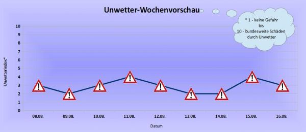 In der kommenden Wetterwoche bleibt uns das wechselhafte Sommerwetter zwar über weite Strecken erhalten, jedoch bleibt die Unwettergefahr für den Zeitraum doch eher überschaubar. Vor allem am Dienstag und am Wochenende besteht nur ein geringes Risiko für Gewitter, an den übrigen Tagen sind Gewitter zwar etwas wahrscheinlicher, treten jedoch überwiegend nur örtlich auf, vor allem am Donnerstag sind jedoch vermehrt Gewitter möglich, das Gewitterpotenzial ist dabei regional auch erhöht.