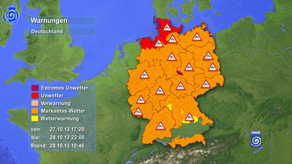 Das Orkantief 'Christian' liegt zur Zeit mit seinem Zentrum östlich der britischen Inseln und zieht in Richtung Westen. Die stärksten Böen wurden bisher auf den Gipfeln der Mittelgebirge gemessen: knapp 160 km/h auf dem Brocken im Harz, in der Nacht bereits 100 km/h auf dem Fichtelberg im Erzgebirge. Auch in der Pfalz gab es auf den Gipfeln Böen mit 100 km/h, sowie auf dem Feldberg im Schwarzwald.