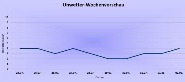Die Gefahr durch Unwetter bleibt in der laufenden Woche begrenzt. Am Montag und Dienstag fällt häufig Regen, der jedoch regional auch kräftig und gewittrig ausfällt. Am Mittwoch ist es ein dann meist nur zeitweilger Regen. Donnerstag deuten sich bei wechselhaftem und weiterhin recht kühlem Wetter wieder einzelne Gewitter an. Im weiteren Verlauf zum Wochenende zeigt sich die Witterung insgesamt stabiler bei zudem wieder ansteigenden Temperaturen.