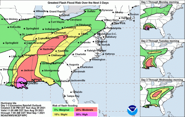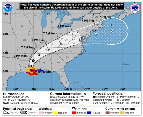 Schon gegen Montagmittag deutscher Zeit ist "Ida" "nur" noch ein tropischer Sturm und zieht in Folge in den nächsten Tagen als normales Tief über die Oststaaten hinwegziehen.