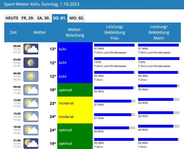 Vor allem das Wetter ist es nämlich, welches Veranstaltungen wie dem Köln Marathon Anfang Oktober einen Strich durch die Rechnung machen kann. In diesem Jahr bleiben sämliche Wetterturbulenzen dagegen auf Distanz; vielmehr erwartet vor allem die Läufer der Halbmarathondistanz (Startzeit 09:00 Uhr) bestes Laufwetter, wie auch unser Sport-Wetter für Köln dem Samstag bescheinigt: