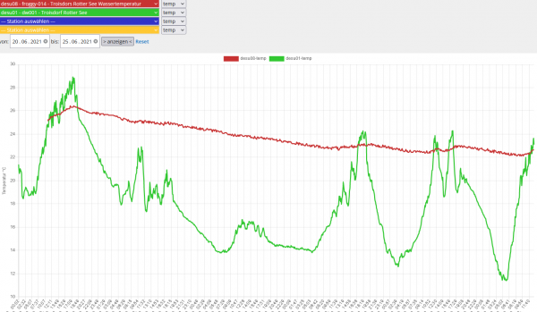 Auch bei unserem eigens betriebenen Temperatursensor im Rotter See in Troisdorf (Rhein-Sieg-Kreis) ist der Aufwärtstrend nun zu beobachten - aktuell beträgt die Wassertemperatur hier 22,7 Grad (rote Linie). Die grüne Linie zeigt die Lufttemperatur über den selben Verlaufszeitraum (20.06. - 25.06.).