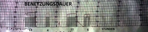 Beispiel: Über vier Tage erstreckt sich das Messintervall hier. Am ersten Tag waren an 13 Stunden die Blätter benetzt, am zweiten Tag an vier, am dritten an elf und am vierten an sechs Stunden. Der relevante Benetzungswert liegt hierbei bei mindestens 20.