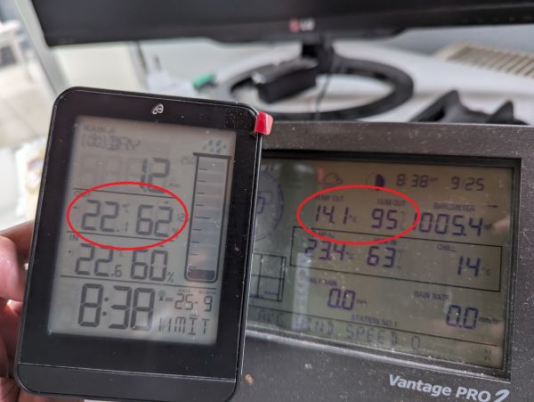 Das Foto zeigt den direkten Datenvergleich der Auriol-Station mit einer Davis Vantage Pro 2 - während die Innenraumwerte zumindest halbwegs übereinstimmen, ist dies bei den Außenwerten nicht der Fall. Die Temperaturabweichung lag Mittwochfrüh bei acht Grad.