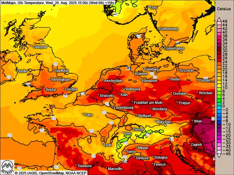 Die Lufttemperaturen nach GFS für Mittwochnachmittag (15 Uhr):