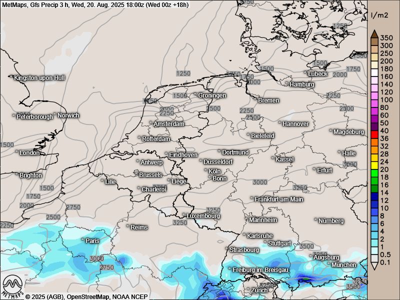 Die Drei-Stunden-Regenmengen am Mittwochnachmittag (bis 18 Uhr) nach GFS: