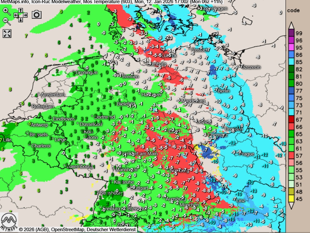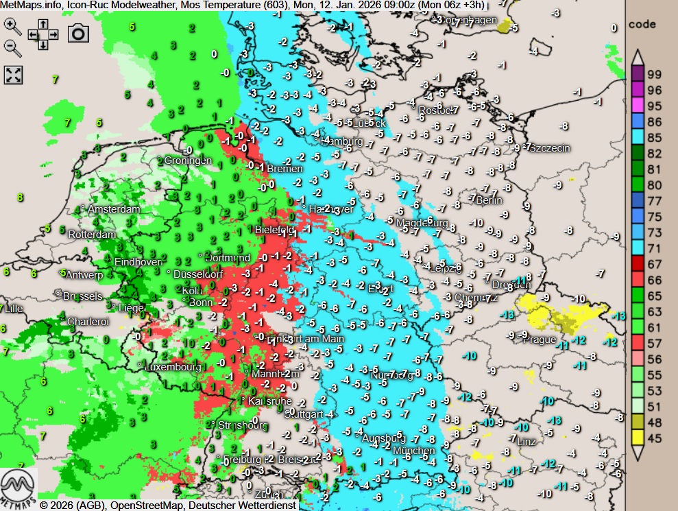 Bereits deutliche Plusgrade im Westen, gefrierender Regen aktuell vor allem in Teilen von Rheinland-Pfalz und Hessen.
