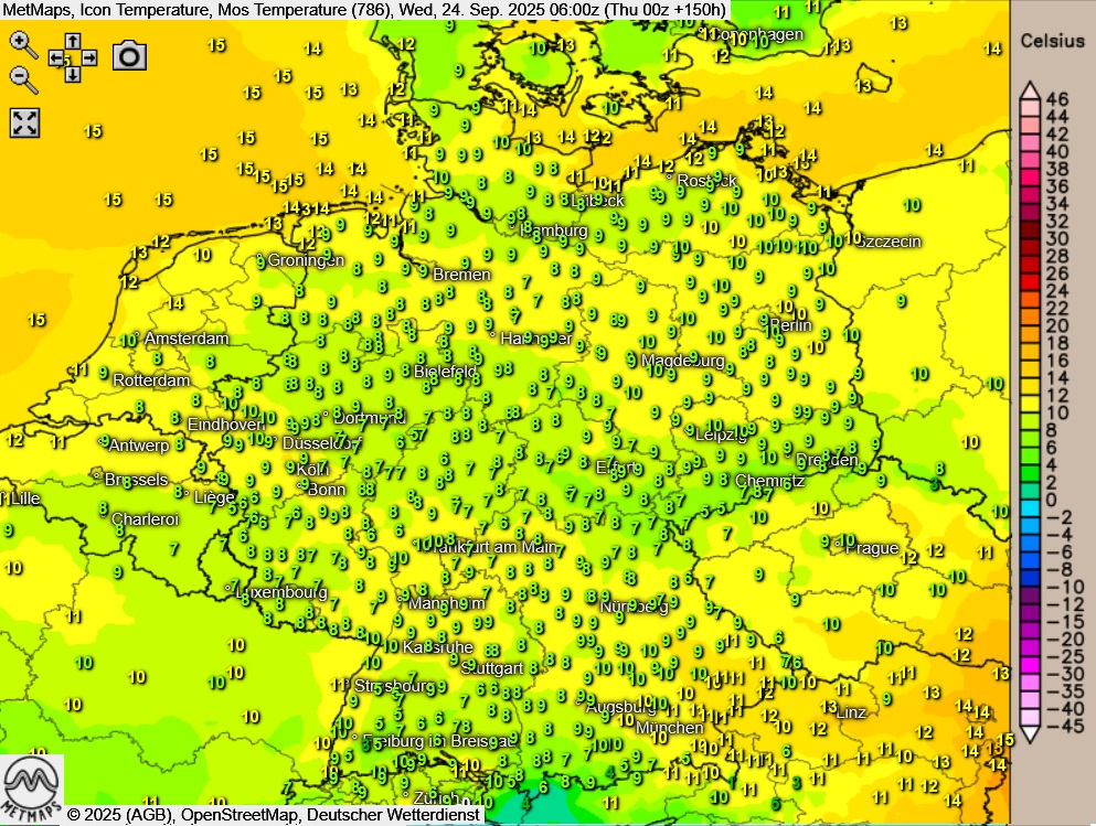 Die Lufttemperaturen sowie die Temperaturabweichung am Mittwochmorgen (06:00 Uhr) nach Icon: