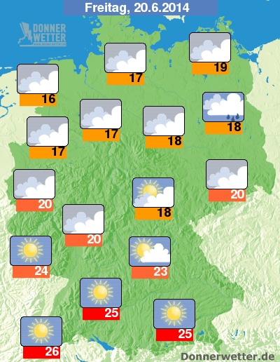 An Fronleichnam ist es vor allem in der Nordhälfte wechselnd oder dicht bewölkt, im Süden, Osten und der Mitte Deutschlands zeigt sich häufig die Sonne. Regen ist nicht in Sicht, die Höchstwerte steigen im Tagesverlauf auf Werte um 17 Grad in Ostfriesland und um 26 Grad entlang der Alpen.