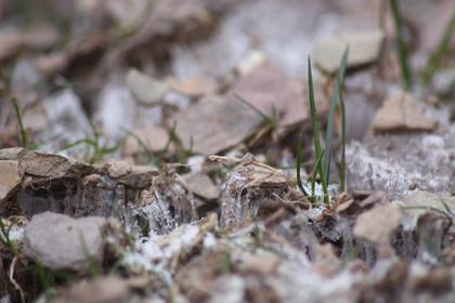 Der Wintereinbruch vor dem Wochenende hat im Donnerwetter.de Wetterpark zur Frosthebung am Boden geführt. Durch den Luftfrost bildete sich Eis und wenig Reif auf dem Boden. Die Feuchtigkeit im ungefrorenen Boden strömte zur Oberfläche und bildete kleine Eissäulen von wenigen Millimetern bis Zentimetern, die so kräftig waren, um darauf Steine und Erdboden in die Luft zu heben.