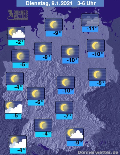 Knackig kalte Temperaturen halten dann bei vielfach sternenklarem Himmel die kommenden Nächte für uns bereits - im Osten und Nordosten sinken die Tiefstwerte stellenweise in die zweistelligen Minusbereich.