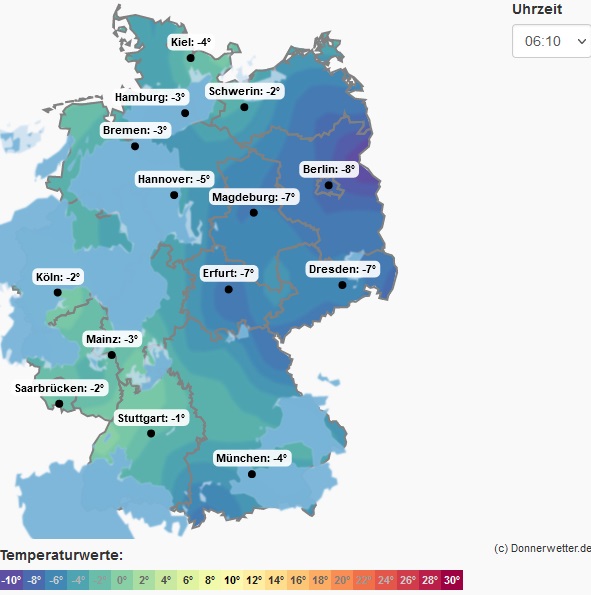 Die neue Woche startet in nahezu allen Landesteilen mit frostigen Aufstehwerten: Unser Nowcasting zeigt die aktuellen (6.10 Uhr) Lufttemperaturen in Deutschland, besonders warm anziehen sollte man sich für den Arbeitsweg in der Landesmitte sowie in der Osthälfte.