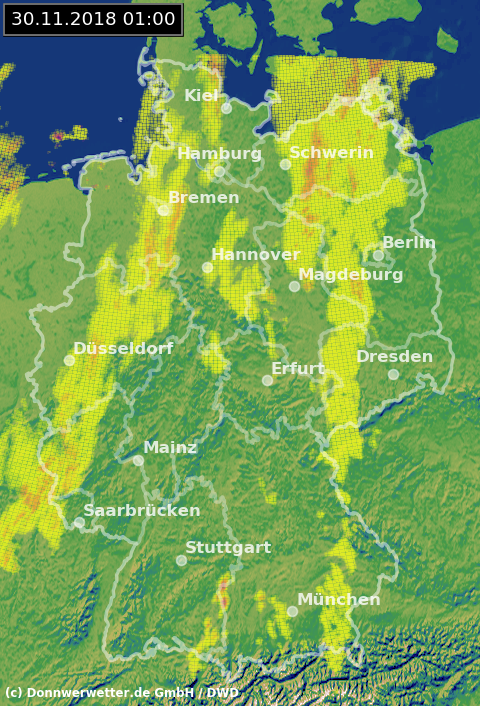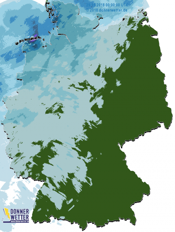 Das Radarbild zeigt einerseits eine Zone mit leichten bis mäßigen Regensignalen im Nordosten. Achtung, am Ostrand dieser Zone trifft der Regen auf die kältere Luft und kann am Boden stellenweise zu Glatteis gefrieren. Und eine zweite nachrückende schwache Signalzone mit etwas Regen. Sonst präsentiert sich der Himmel über Deutschland überwiegend wolkenverhangen und nur stellenweise aufgeklart.