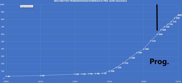 Die folgende Grafik zeigt die Verlaufskurve des globalen Primärenergieverbauchs seit 1800, inklusive einer Schätzung für die kommenden Jahrzehnte bis 2050.
