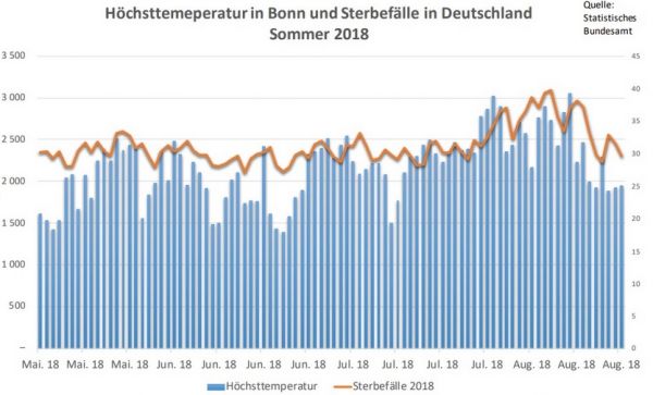 Die folgende Grafik vergleicht die Anzahl der Sterbefälle in Deutschland mit den Höchsttemperaturen im Sommer 2018. Auffällig ist hier ein starker Anstieg beider während einer Phase mit sehr hohen Temperaturen um 40 Grad zwischen Mitte Juli und Mitte August. Bei sehr hohen thermische Belastungen sterben mehr Menschen als bei moderaten Sommertemperaturen. Auch im Zuge der aktuellen Hitzewelle ist mit einem deutlichen Anstieg der Sterbefälle zu rechnen.