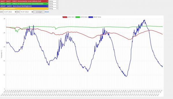 Unsere Grafik zeigt eine viertägige Messreihe in unserem Büro (14. - 18-7.) Die grüne Linie stellt die kältesten Messwerte dar; obwohl die Außentemperaturen zum Messzeitpunkt zum Teil 10 Grad unter denen lagen, die wir in den nächsten Tagen erreichen werden, näherte sich die Innentemperatur teilweise schon der 30-Grad-Marke an. In den kommenden Tagen wird die Innenraumtemperatur in vielen unklimatisierten Gebäuden häufig Werte um 30 bis 32 Grad erreichen.