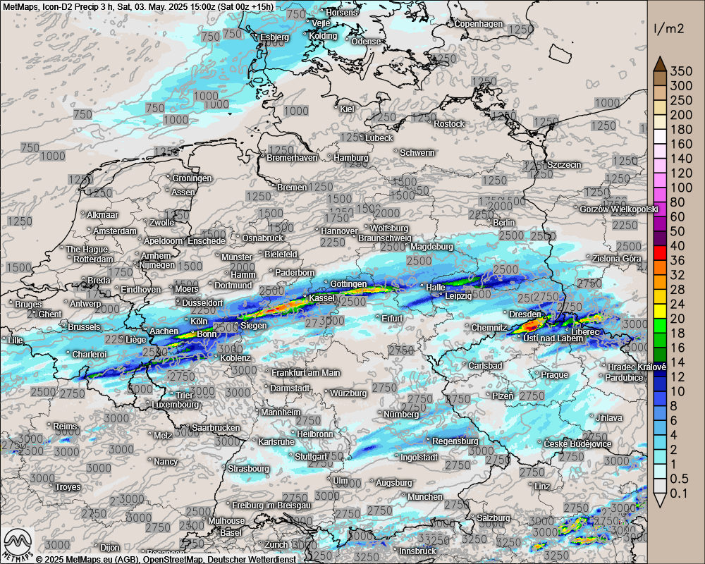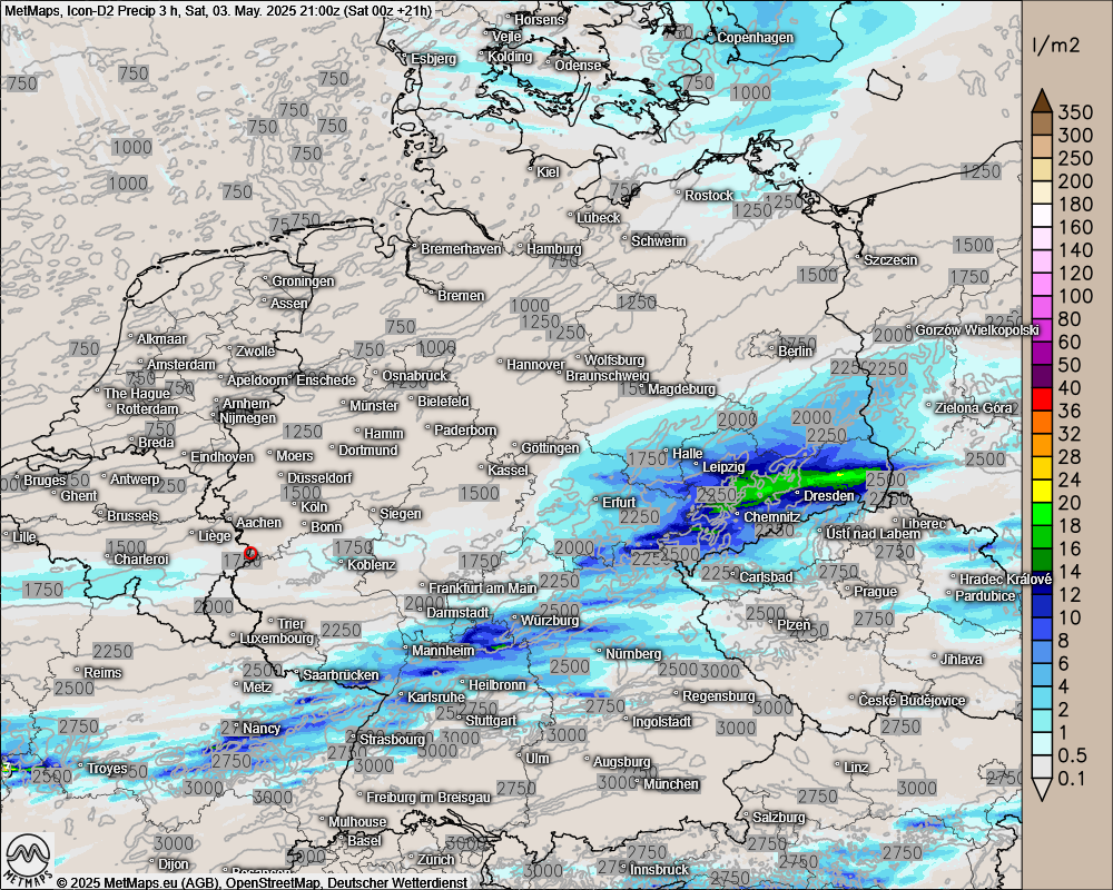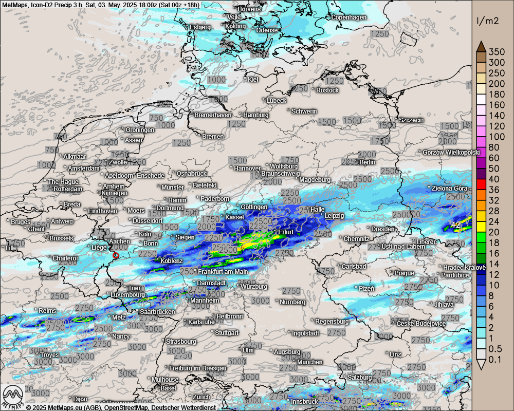 Nachfolgend die von Icon-D2 berechneten 3-Stunden-Niederschlagsmengen für den Samstagmittag, sowie den (späten) Samstagabend.