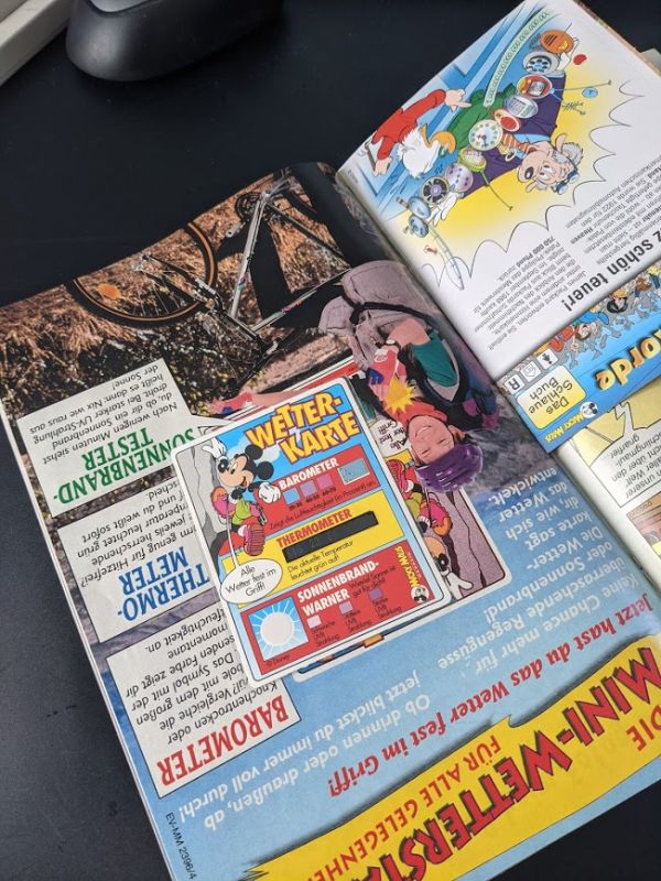 In der heutigen Zeit könnte man der Wetterkarte aus dem "Micky Maus Magazin" (Nr. 23 vom 03.05.1996) durchaus den Titel "Wetterapp der 90er-Jahre" verleihen, lieferte sich doch - und das ganz ohne (!) auf Datenvolumen oder Akkustand achten zu müssen - auf Abruf die wichtigsten meteorologischen Daten in Livegeschwindigkeit.