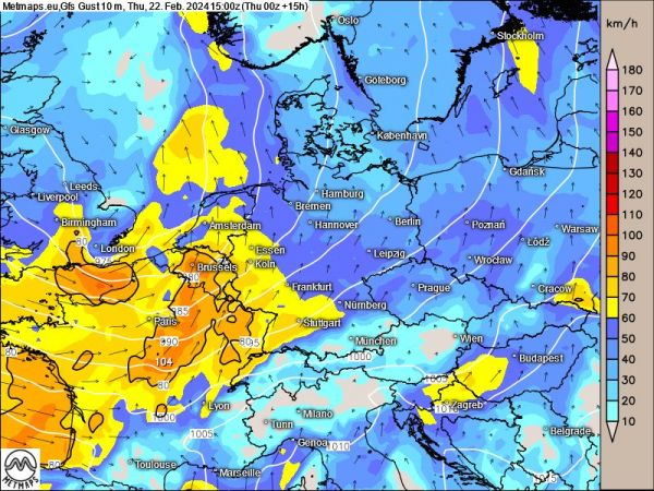 Auf den Karten zu sehen sind die zu erwarten Spitzenwindgeschwindigkeiten (10 m Höhe) in Mittel- und Westeuropa am Donnerstag sowie Freitagfrüh lt. US-amerikanischen GFS-Modells.