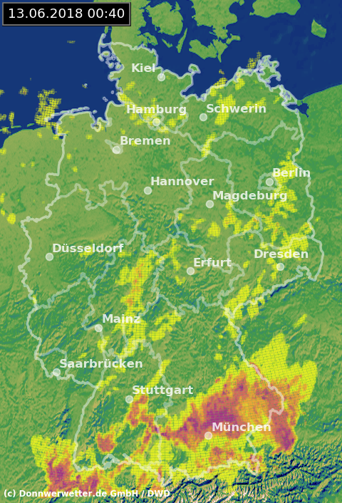 Das Radarbild zeigt aktuell im Süden teils stärkere Signale mit Regen, vereinzelt blitzt und donnert es auch noch. Sonst erkennt man nur schwache Signale mit etwas Regen, Sprühregen oder leichten Schauern, die regional über der Mitte und im Norden auftreten. Sonst präsentiert sich der Himmel über Deutschland überwiegend wolkenverhangen und nur selten aufgeklart.