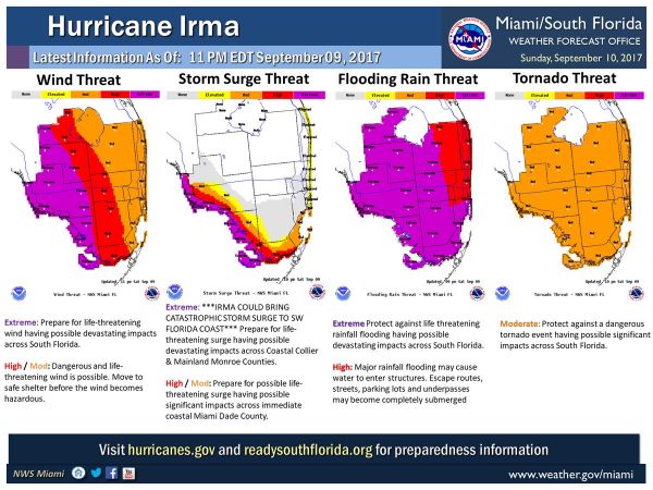 Irma wird bis Montag durch den Bundesstaat ziehen und dann nach Georgie weiterziehen. Dort löst er sich am Dienstag/Mittwoch langsam auf. Bis dahin wird er für erhebliche Probleme sorgen. Zunächst sind die Windböen, die Sturmflut und der viele Regen. Diese Wettereöemente werden das öffentliche Leben mindestens bis Dienstag lahmlegen. Ca. 15-20 Mio. Menschen sind betroffen.