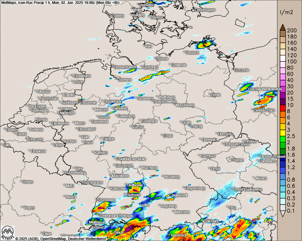 Die Ein-Stunden-Niederschlagsmengen bis 15:00, 16:00 und 20:00 Uhr nach ICON-RUC in der Übersicht: