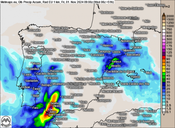 Für die Region um Vinaròs, etwa 160 Kilometer nördlich von Valencia liegend, fallen laut aktueller Modellläufe zwischen Samstag und Montag nochmals 80 bis 90 l/m² Niederschlag.
