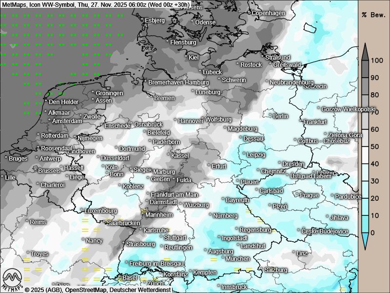 Der Übergang hin zu mildem Adventswetter vom Atlantik ist im Westen bereits zu sehen - das nächste Tief lauert hier bereits. Noch vor dem Wochenende kommt es zu uns und bringt Wind und Regen mit.