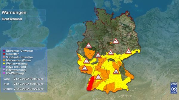 Wie so häufig bei dieser Wetterlagenkonstellation kommt nun gleich von zwei Stellen ordentlich Wasser zusammen: Einerseits natürlich in Form von Niederschlag -und der fällt bis Heiligabend im Süden und Westen nicht zu knapp: Lokal können 30 bis 50 Liter Regen pro Quadratmeter zusammenkommen, es bestehen aktuell bereits Unwetterwarnungen des Deutschen Wetterdienstes vor Dauerregen (s. Karte). Auf der anderen Seite steht die Schneeschmelze, die zusätzliches Wasser freigibt.