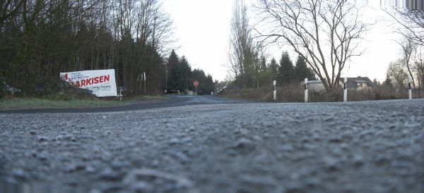 Unser Bild zeigt eine von Reif bedeckte Straße aus der Mäuseperspektive.