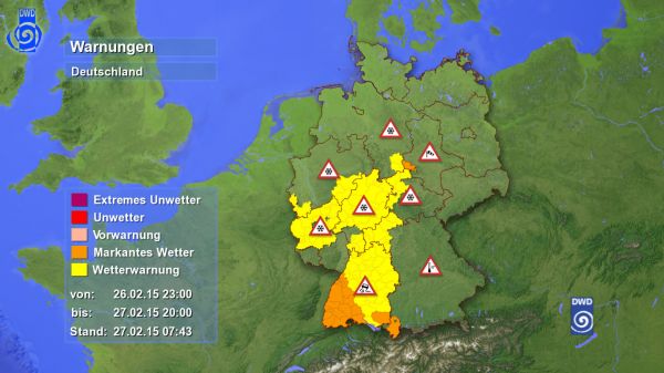 In Niedersachsen, HH, SH, NRW, RP und BW regnet es im Flachland. Ab 400-500 m schneit es. Für Bayern, Thüringen, Hessen (Osten) und Sachsen-Anhalt wird zum Teil Glätte durch Schnee und Eis erwartet. Planenn Sie aufgrund des schlechten Wetters längere Fahrzeiten durch Deutschland ein. Trocken bleibt es bis zum Abend in Berlin, Sachsen, Osten MV und Osten Brandenburgs.