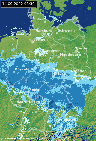 Eine Luftmassengrenze, die feuchtwarme subtropische Luft von einfließender polarer Meeresluft trennt, verläuft an diesem Mittwoch entlang der Mittelgebirge: Von der Eifel im Westen über das Sauerland bis zum Erzgebirge regnet es dabei dauerhaft. Südlich davon steht heute ebenfalls Dauerrregen auf dem Programm, vom Schwarzwald bis zu den Alpen ist heute neben einzelnen Schauern zudem mit gewittrigem Regen zu rechnen.