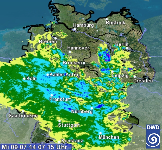 Der Mittwoch startet wieder mit sehr viel Regen in der Südwesthälfte, wie das Radarbild zeigt. Durch Sachsen-Anhalt ziehen bereits Gewitter.