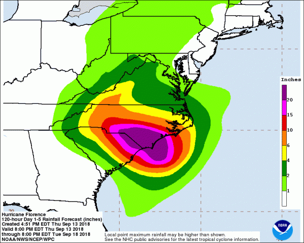 Obwohl "Florence" mittlerweile auf einen Hurrikan der Kategorie 1 zurückgestuft wurde, bleibt der Tropensturm für die US-Ostküste brandgefährlich. Weniger die Winde als vielmehr die enormen Regenmengen in Verbindung mit der Langsamkeit und Größe des Sturmgebildes beunruhigen: Aktuell bewegt sich der Hurrikan nur noch mit einer Geschwindigkeit von 10 km/h vorwärts, das Auge von "Florence" braucht wohl noch einige Stunden, bis es auf Land trifft. Bis dahin ist also mit schweren Überflutungen in den betroffenen Küstenregionen zu rechnen.
