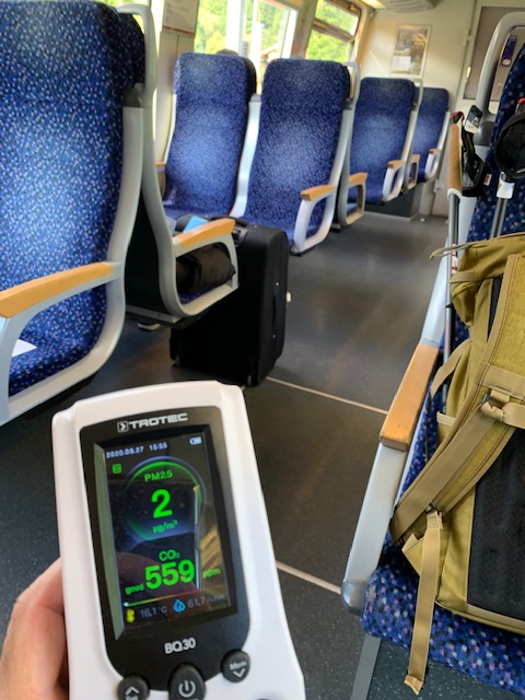 Die wirkliche Überraschung wartete dann aber im Inneren: In allen von uns durchgemessenen Schienenwagen erschienen stets Werte unter 800 ppm auf dem Partikelmesser; sogar in der rappelvollen S-Bahn in Salzburg und im Regiozug in Rosenheim.