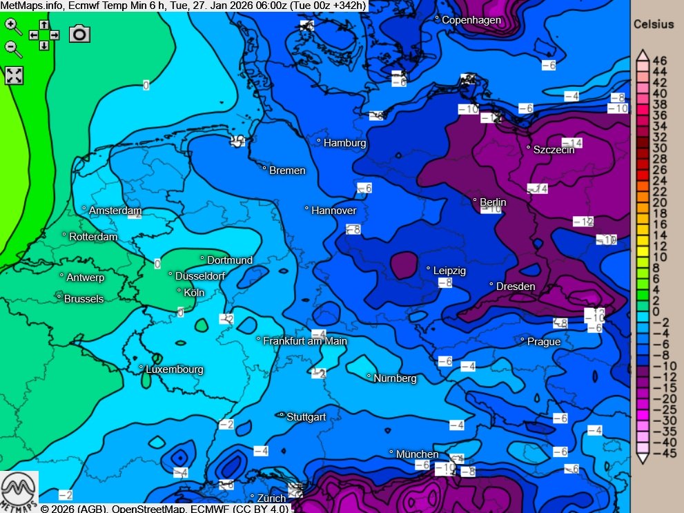 Die Sechs-Stunden-Temperaturminima und die Schneehöhen für den 27.01. (06:00 Uhr) nach ECMWF sowie die 24-Stunden-Schneemengen bis 28.01. (06:00 Uhr) nach GFS: