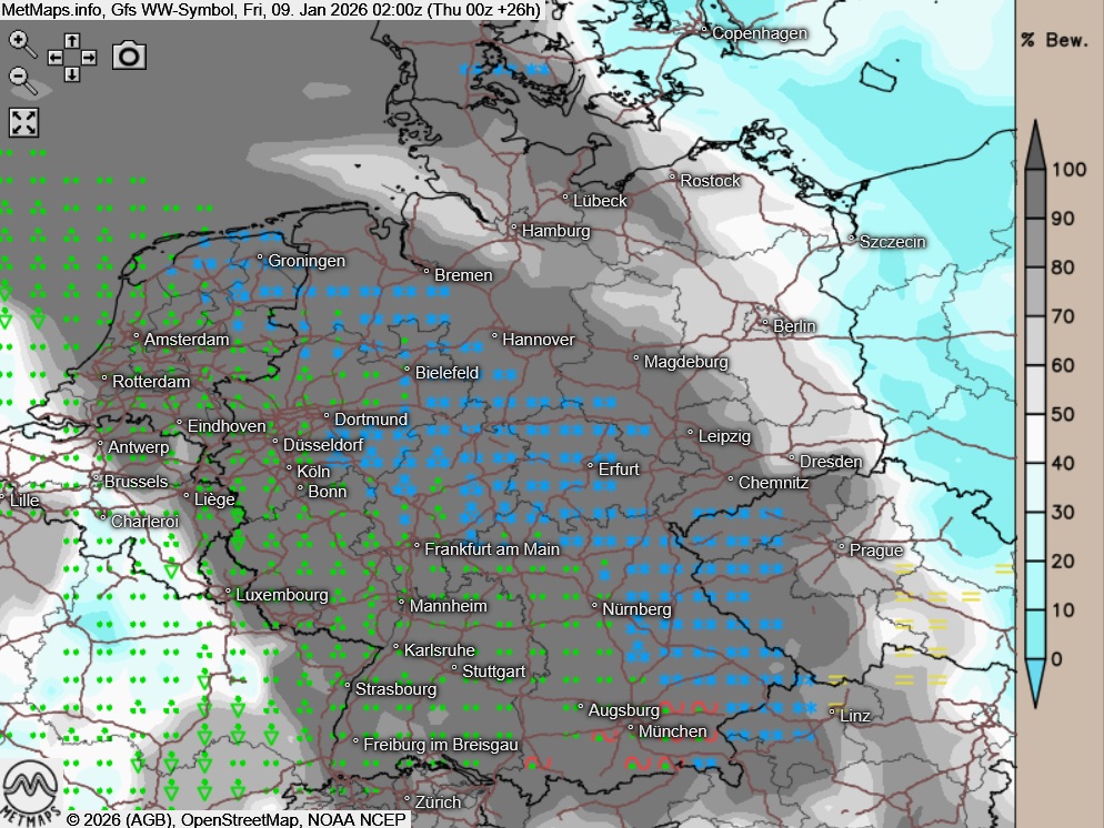 In der Nacht zum Freitag bleibt es im Norden und Nordosten bei leichter Bewölkung meist trocken. Über den restlichen Landesteilen breitet sich ergiebiger Niederschlag aus: Vom Nordwesten bis in den Südosten fällt dieser meist als Schnee, sonst als Regen, teils gefrierend. Vorsicht, lokal besteht erhebliche Glättegefahr!