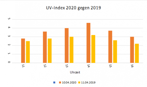 Gut sichtbar wird die Kraft der UV-Strahlung in unserer Grafik, welche den UV-Index vom 11.04.2019 dem des 10.04.2020 gegenübersetzt. Die Grundlage bieten hierzu Daten von drei unterschiedlichen Messstationen.