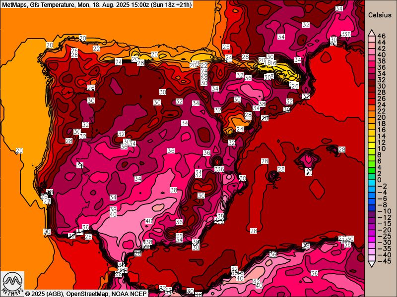 Lufttemperaturen Spanien Montag. 15:00 Uhr nach GFS