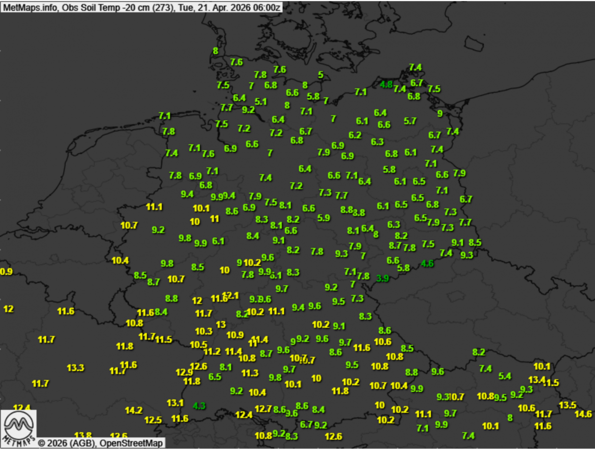 Da Boden jedoch ein schlechter Wärmeleiter ist, dauert es oft mehrere Tage, bis die Sonnenenergie in 20 cm Tiefe ankommt. Die aktuell kühlen Nächte (Nachtfrostgefahr!) wirken diesem Prozess entgegen: Sie kühlen die oberen Erdschichten wieder aus und bremsen den Temperaturanstieg in der Tiefe ab.
