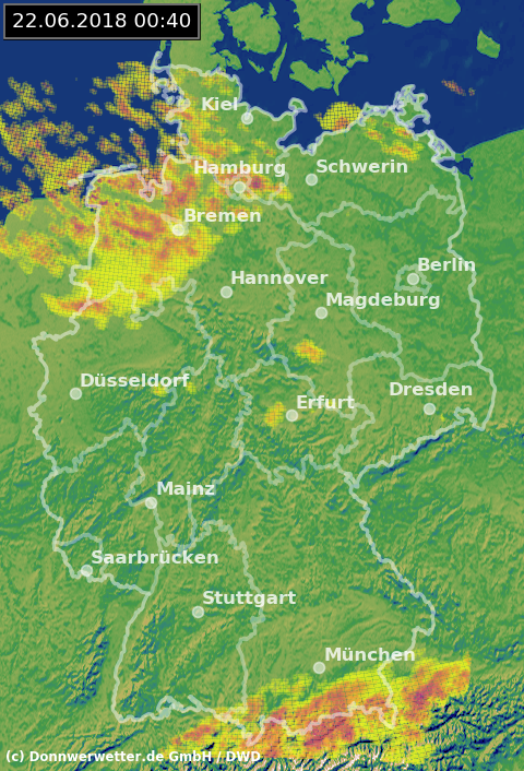 Heute treten vom Emsland über die Mittelgebirge bis zum Bayrischen - Wald weitere Regengüsse auf. Die Niederschlagsmengen liegen in der Regel zwischen 1 und 10 Liter pro Quadratmeter. Sonst bleibt es überwiegend niederschlagsfrei.