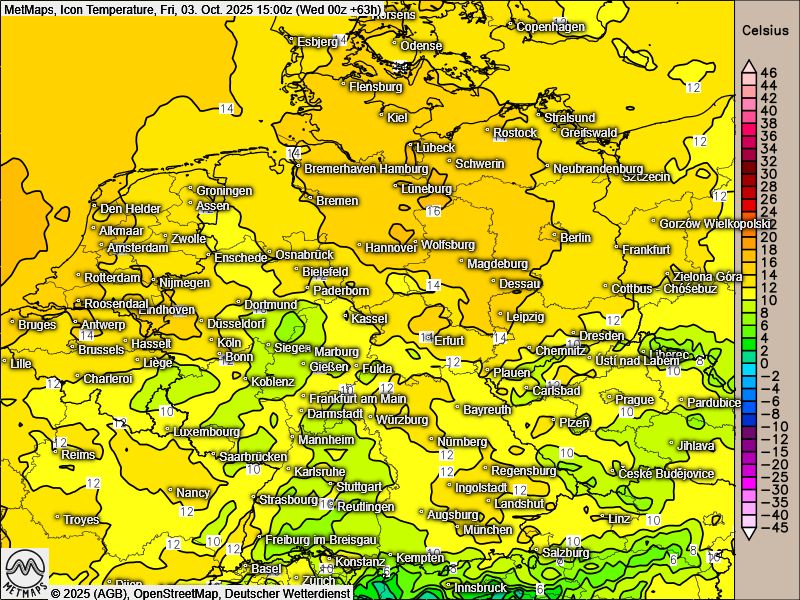 Die Lufttemperaturen am Donnerstag- und Freitagnachmittag (15:00 Uhr) nach Icon: