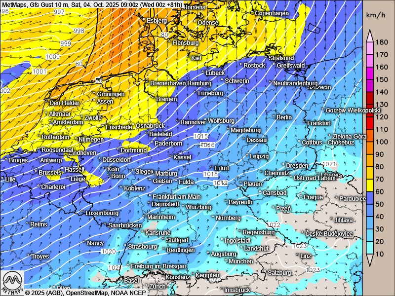 Am Samstag kommt dann die heftige Wetteränderung mit Sturmböen und Regen - hier die GFS-Variante (Windböen 10 m am Samstag, 09:00 Uhr):