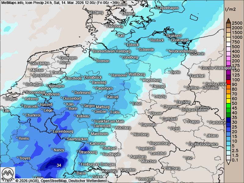 Morgen erreicht der Regen zunächst den Südwesten Deutschlands, bevor er sich bis zum Abend auch auf die östlichen Landesteile ausdehnt. Die beigefügte Grafik zeigt die bislang gemessenen Regenmengen bis zum heutigen Mittag.