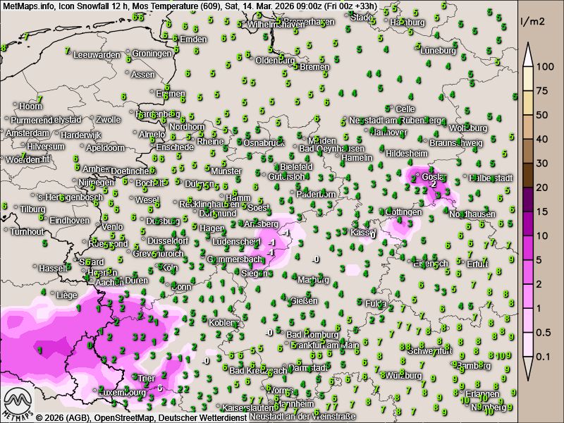 Am Samstag stellt sich besonders im Westen des Landes ein trübes und nasses Wetter ein. In höheren Lagen sinkt die Schneefallgrenze deutlich: Ab etwa 400 bis 500 Metern Höhe fällt teilweise kräftiger Schneefall. In Mittelgebirgen wie der Eifel, dem Sauerland und dem Harz sind örtlich bis zu 10 Zentimeter Neuschnee möglich.