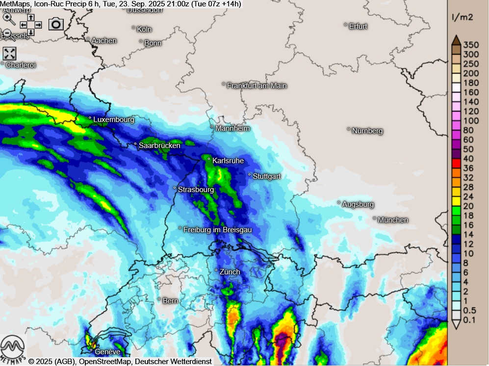 Die Nachmittagswerte um 15 Uhr nach GFS sowie die Sechs-Stunden-Regenmengen (15:00 - 21:00 Uhr) nach ICON-RUC für den Südwesten: