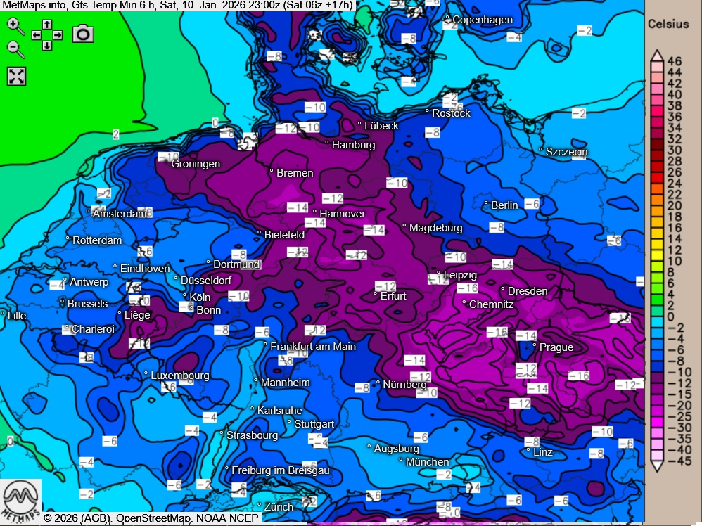 Besonders über offenen Schneeflächen und in Senken können die Werte nachts deutlich unter minus 10 Grad fallen, was die Glätte noch verstärkt.