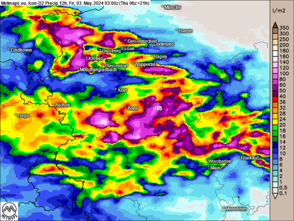 Ein Extrembeispiel liefert zur Zeit die 12-Stunden-Niederschlagsberechnung des DWD-Modells ICON, welches unter anderem für Westerwald und Eifel Gesamtniederschlagsummen von 165 l/m² ausgeht.